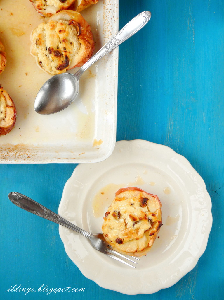 apróra vágva hozzáadjuk a leeső almadarabokat, végül a mazsolát is. Megtöltjük az almák közepét a túrókrémmel, vajdarabkákat teszünk rá, majd az